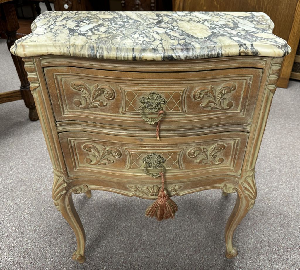 French Reproduction Marble Top Commode, two drawer, good condition, bleached finish, 29"h., 23"w. Location Row 3 French Reproduction Marble Top Commode, two drawer, good condition, bleached finish, 29"h., 23"w. Location Row 3