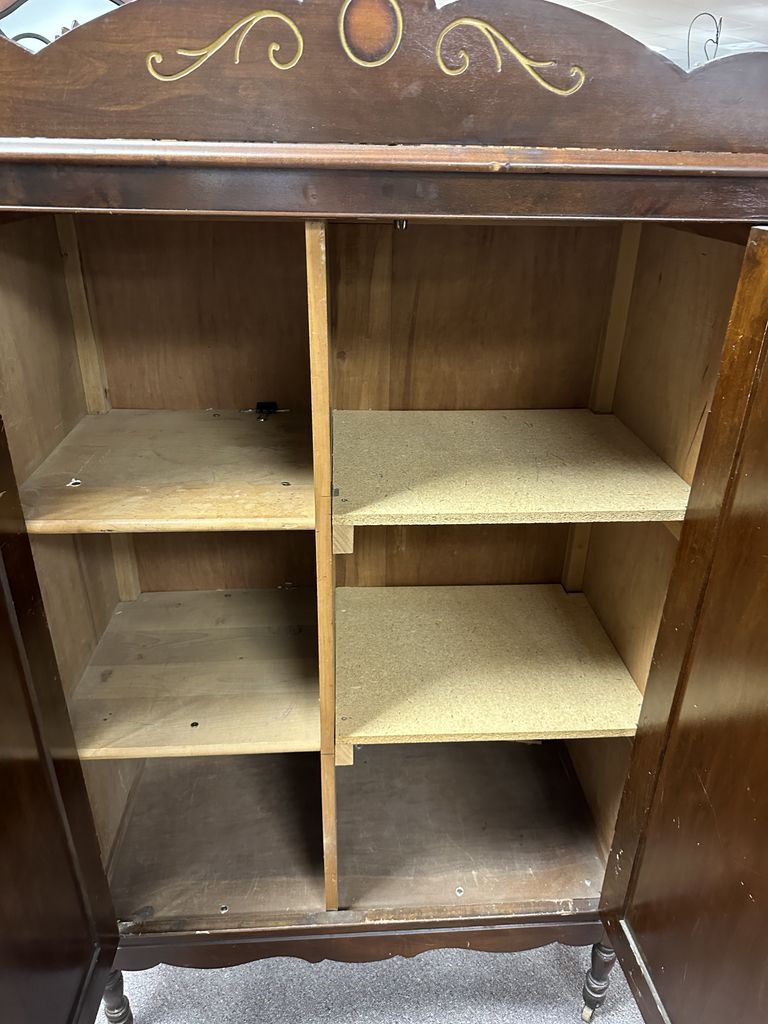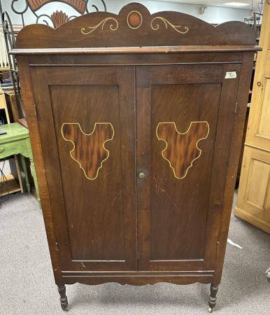 Antique Two Door Walnut Wardrobe, two door, interior shelves, 64"h., 38"w, has scratches on finish, Location Row 3 Antique Two Door Walnut Wardrobe, two door, interior shelves, 64"h., 38"w, has scratches on finish, Location Row 3