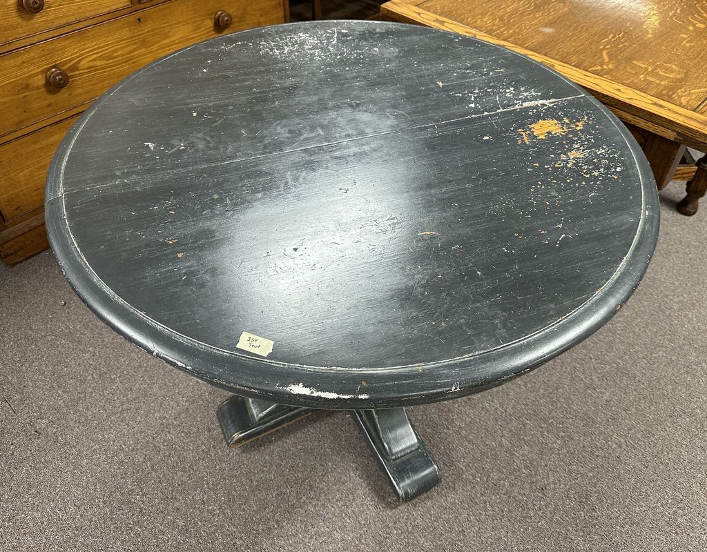 Painted Round Pedestal Table, needs top bolts, has two leaves, 30"h. 42"w, oak Painted Round Pedestal Table, needs top bolts, has two leaves, 30"h. 42"w, oak
