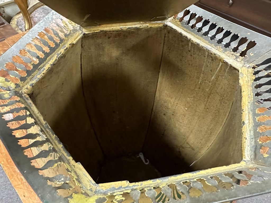 Antique Painted Tin Storage Barrel, brass top gallery, has handles, aged wear, lift top, 21"h., 12"dia Location Row 5 Antique Painted Tin Storage Barrel, brass top gallery, has handles, aged wear, lift top, 21"h., 12"dia Location Row 5