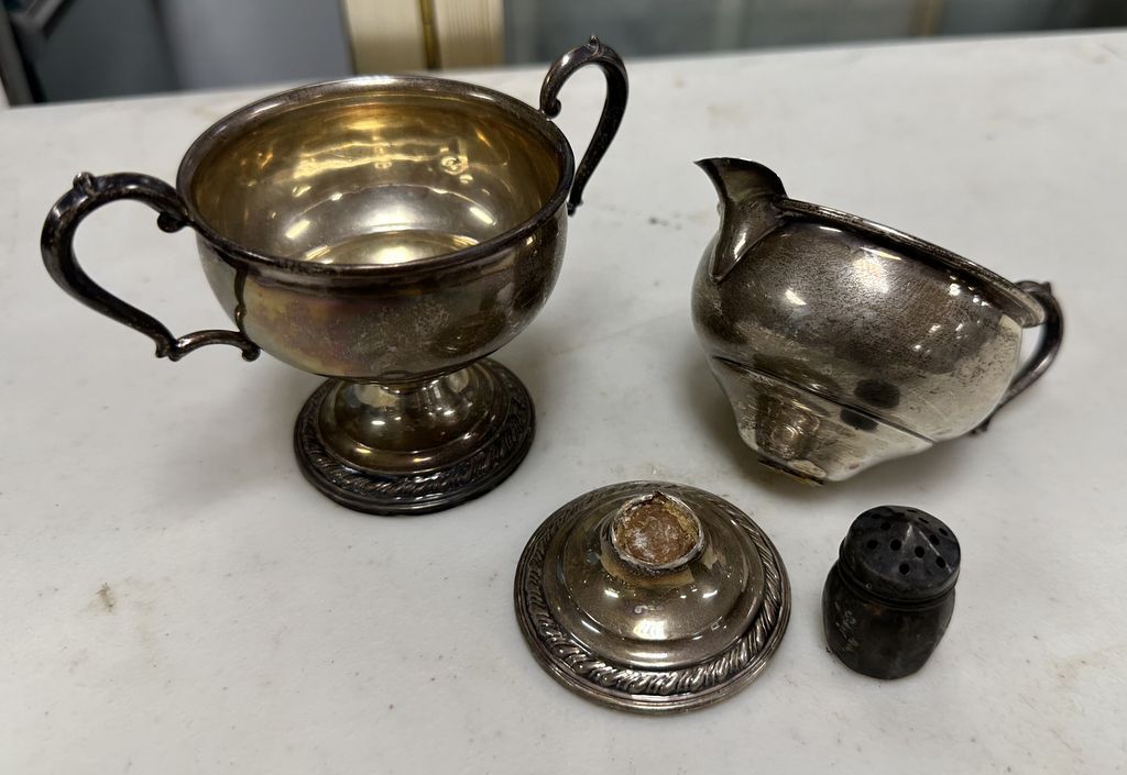 Weighted Sterling Creamer and Sugar and Shaker, Location Front Left Glass Case Weighted Sterling Creamer and Sugar and Shaker, Location Front Left Glass Case