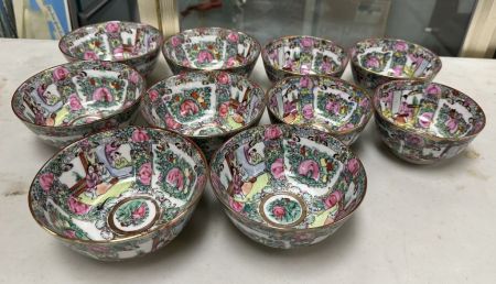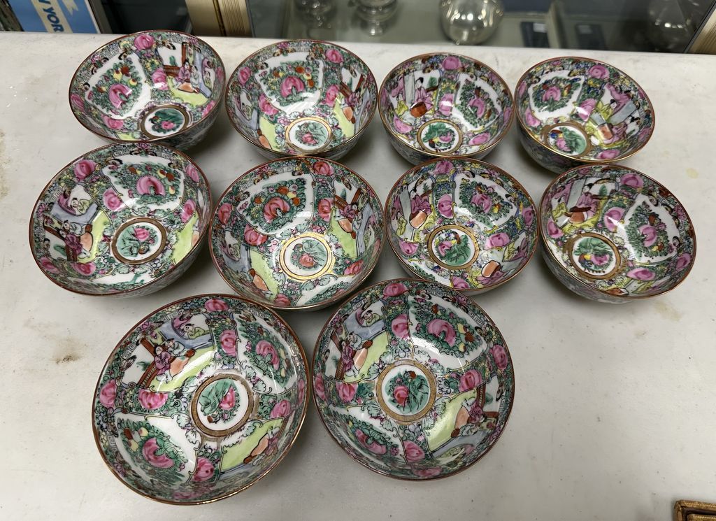 10 Japanese Famillie Rose Medallion Rice Bowls, Location Front Left Shelves 10 Japanese Famillie Rose Medallion Rice Bowls, Location Front Left Shelves