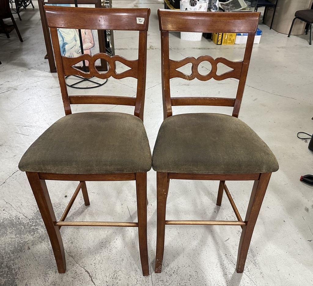Pair of Cherry Traditional Style Bar Stools, usage wear, 29" seat to ground, Location Row 2 Pair of Cherry Traditional Style Bar Stools, usage wear, 29" seat to ground, Location Row 2