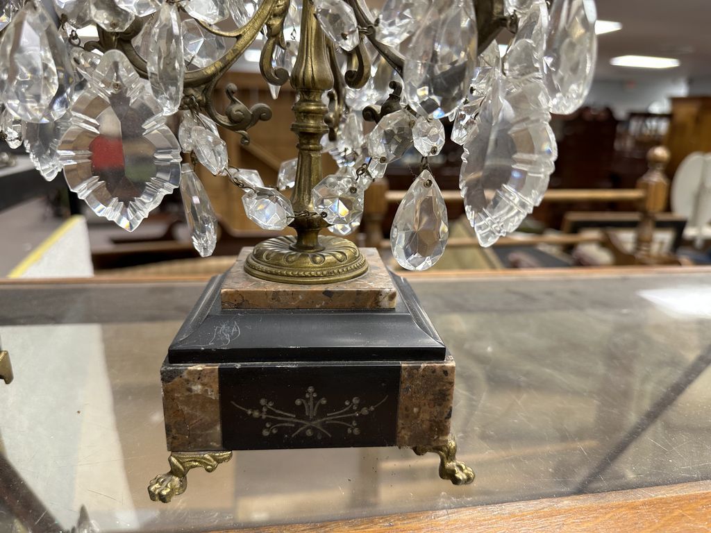 Pair of Brass and Crystal Boudoir Candelabras, 21"h, Location Right Metal Shelves Pair of Brass and Crystal Boudoir Candelabras, 21"h, Location Right Metal Shelves