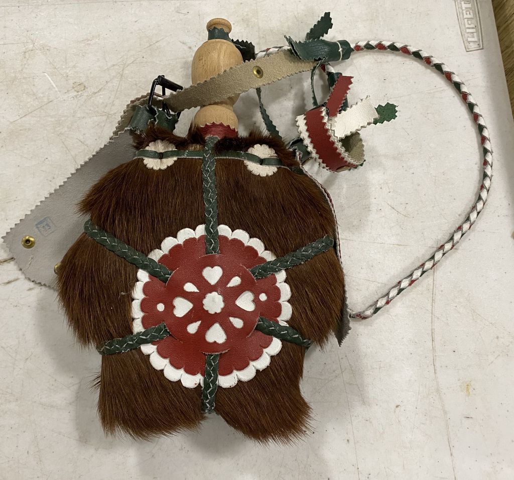 Hand Crafted Native American Water Flask, leather and fur, Location Back Left Metal Shelve Hand Crafted Native American Water Flask, leather and fur, Location Back Left Metal Shelve