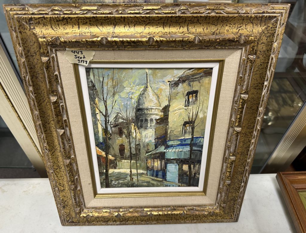 Signed Painting of City View, on canvas, framed, 16"h., 13"w, Location Front Left Shelves Signed Painting of City View, on canvas, framed, 16"h., 13"w, Location Front Left Shelves
