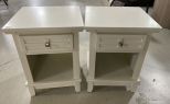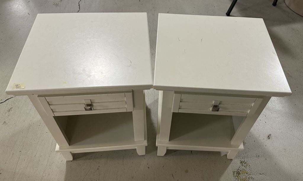 Pair of White Modern Night Stand/Side Tables, single drawer, open fronts, good condition, 24"h., 18"w, Location Row 3 Pair of White Modern Night Stand/Side Tables, single drawer, open fronts, good condition, 24"h., 18"w, Location Row 3