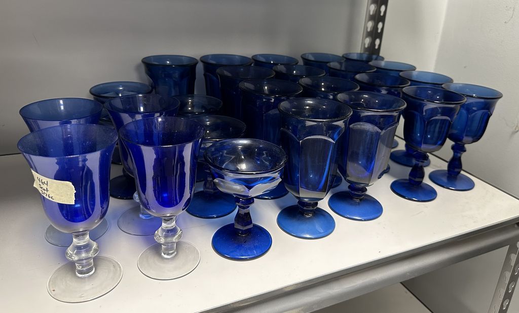 Group of Blue Glass Drinking Glasses, Location Back Metal Shelves Group of Blue Glass Drinking Glasses, Location Back Metal Shelves
