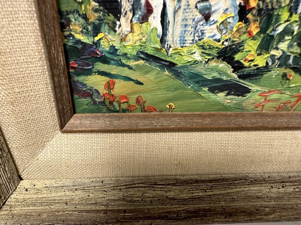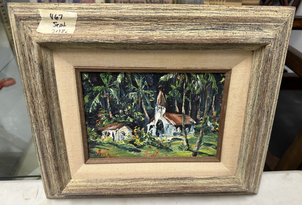 Framed Oil Painting by Old Church, on board, framed, 10"h., 12"w, Location Front Left Shelves Framed Oil Painting by Old Church, on board, framed, 10"h., 12"w, Location Front Left Shelves