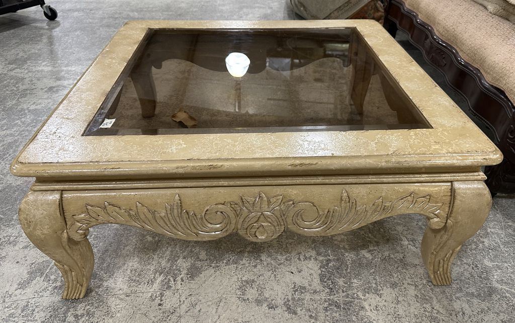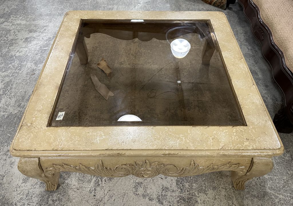 Reproduction Glass Top Coffee Table, tinted glass top, 17"h., 42"w, Location Row 2 Reproduction Glass Top Coffee Table, tinted glass top, 17"h., 42"w, Location Row 2