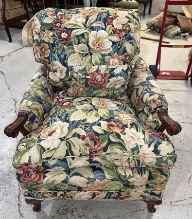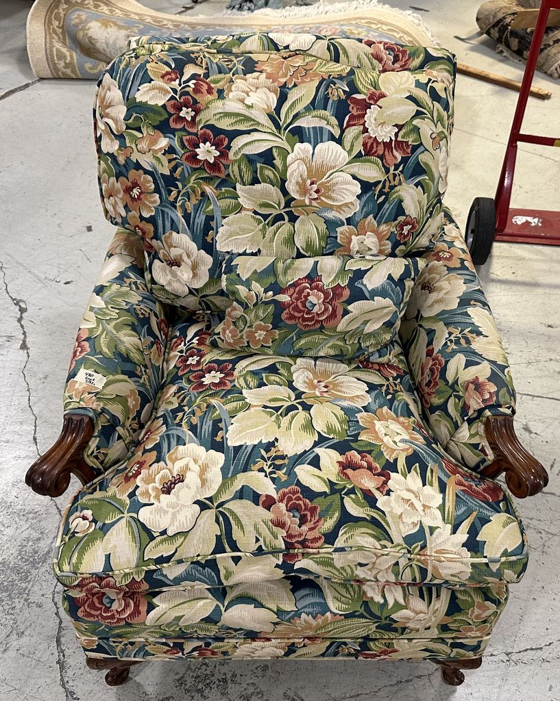 French Style Upholstered Arm Chair, floral design, good condition, Location Row 1 French Style Upholstered Arm Chair, floral design, good condition, Location Row 1
