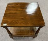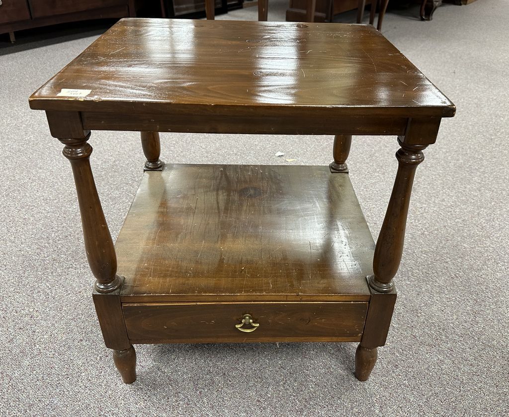 Lammert's Co. Pine Lamp Table, two tier, single drawer, has scratches, 23"h., 21"w, Location Row 3 Lammert's Co. Pine Lamp Table, two tier, single drawer, has scratches, 23"h., 21"w, Location Row 3