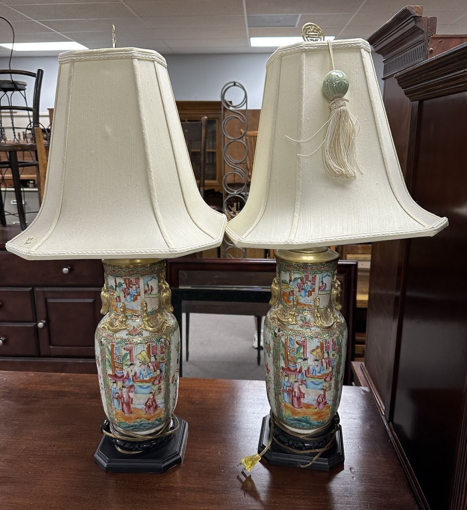 Pair of Hand Painted Chinese Porcelain Vase Lamp, with shades, 31"h, Location Row 3 Pair of Hand Painted Chinese Porcelain Vase Lamp, with shades, 31"h, Location Row 3