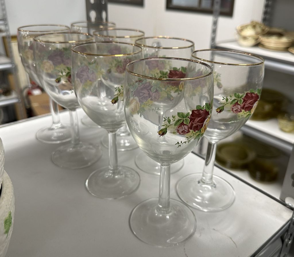 Royal Albert "Old Country Roses" 8 Wine Glasses, Location Back Metal Shelves Royal Albert "Old Country Roses" 8 Wine Glasses, Location Back Metal Shelves