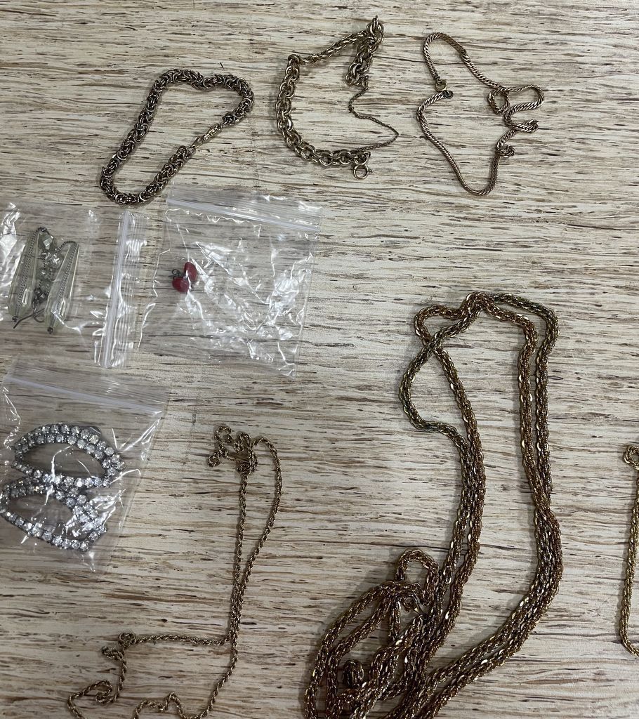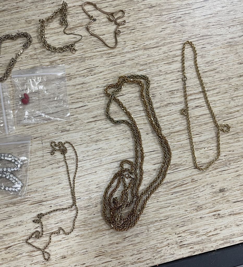 Costume Jewelry 4 Necklaces, 3 Bracelets, Two Pairs of Earrings, and Two Rhinestone Scarf Clips, Location Case by Office Costume Jewelry 4 Necklaces, 3 Bracelets, Two Pairs of Earrings, and Two Rhinestone Scarf Clips, Location Case by Office