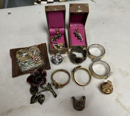 Group of Jay Strongwater Enamel Ornaments, Napkin Rings, and Trinket , Location Wood Slant Case Group of Jay Strongwater Enamel Ornaments, Napkin Rings, and Trinket , Location Wood Slant Case