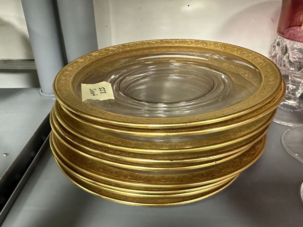 Nine 7 1/2"dia Art Deco Tiffin Gold Rim Rambling Rose Plates, Location Left Office 1 Nine 7 1/2"dia Art Deco Tiffin Gold Rim Rambling Rose Plates, Location Left Office 1