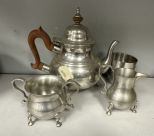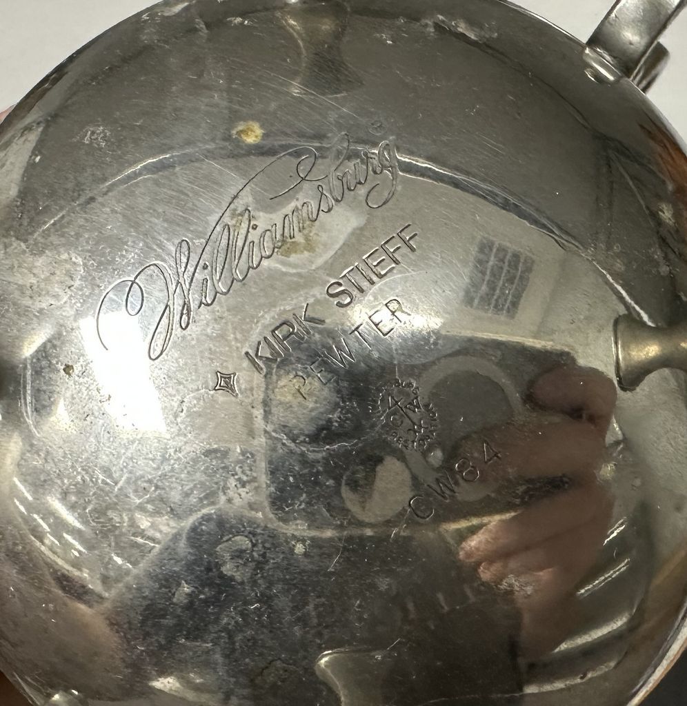 Kurt Stieff Williamsburg Pewter Service Set, Pitcher, creamer, sugar, Location Right Metal Shelves Kurt Stieff Williamsburg Pewter Service Set, Pitcher, creamer, sugar, Location Right Metal Shelves