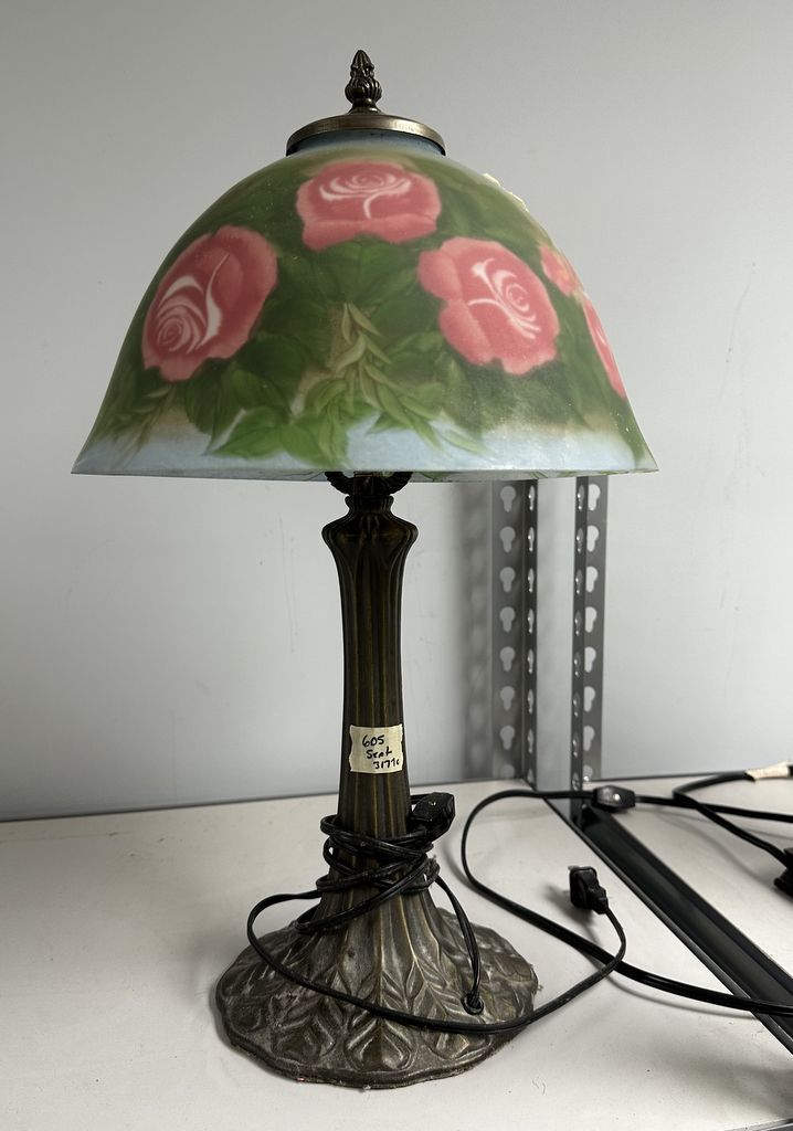 Glass Shade Desk Lamp,Roses, 19"h, Location Back Metal Shelves Glass Shade Desk Lamp,Roses, 19"h, Location Back Metal Shelves