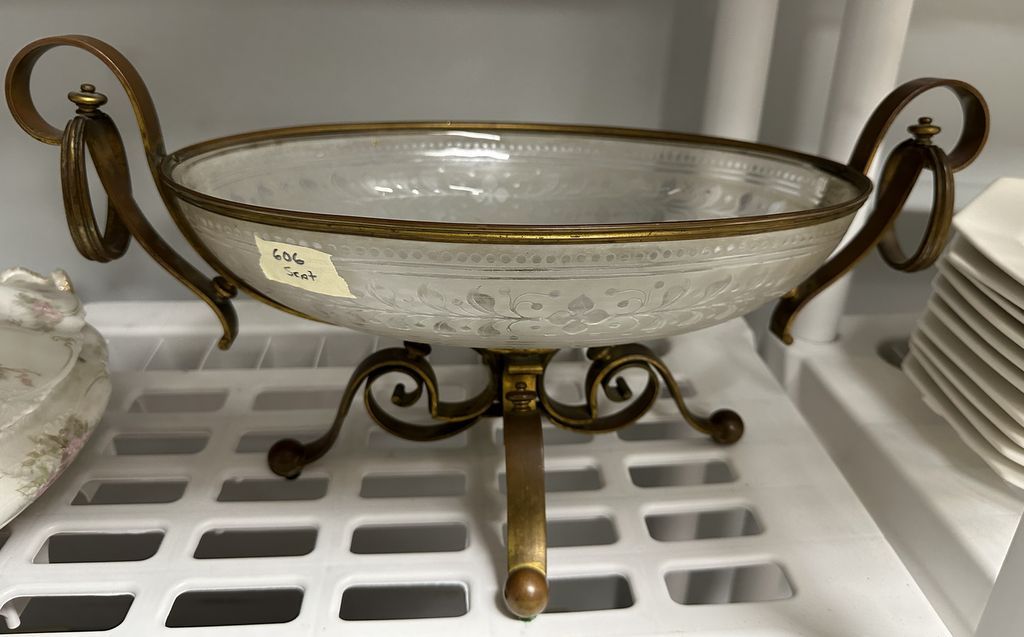 Decorative Brass and Glass Center Piece, etching designs on glass, 19"h, Location Left Office 1 Decorative Brass and Glass Center Piece, etching designs on glass, 19"h, Location Left Office 1