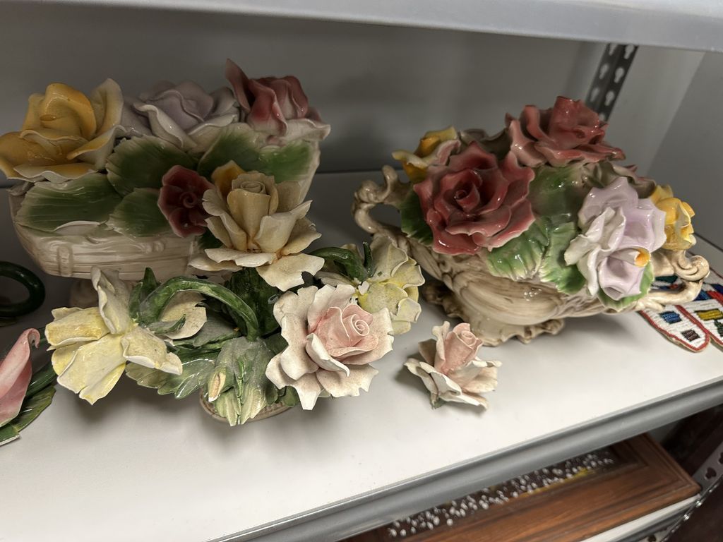 Collection of Porcelain Capodimonte Flower Bouquets, each has chip damage, Location Back Metal Shelves Collection of Porcelain Capodimonte Flower Bouquets, each has chip damage, Location Back Metal Shelves