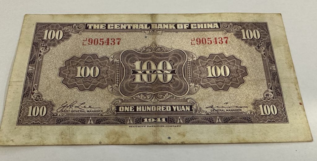 The Central Bank of China 1941 100 Yuan, Location Safe Binder The Central Bank of China 1941 100 Yuan, Location Safe Binder