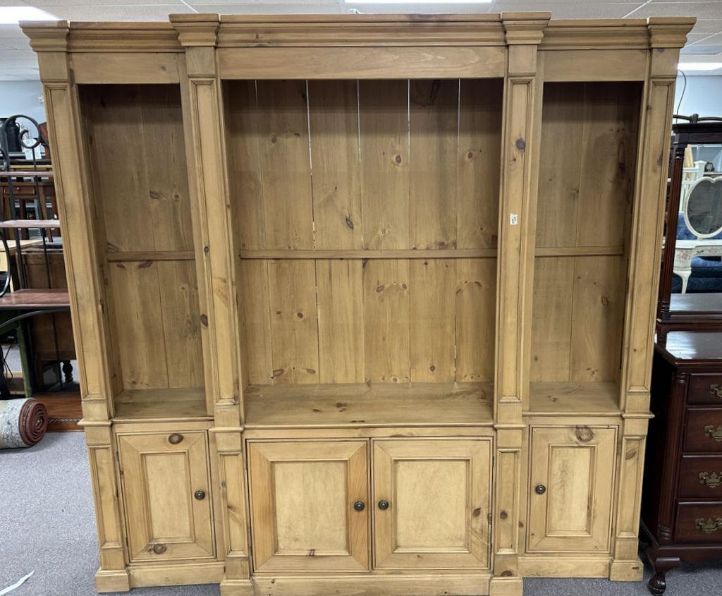 Three Section Pine Entertainment Cabinet, with wood shelving, 83"h., 84"w, Location Row 3 Three Section Pine Entertainment Cabinet, with wood shelving, 83"h., 84"w, Location Row 3