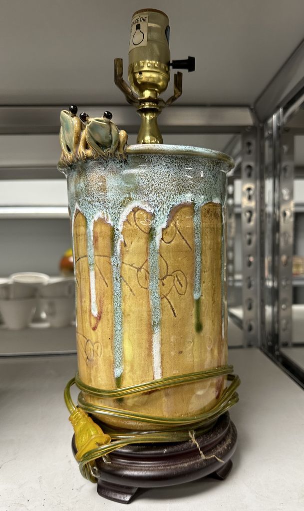 Glazed Stoneware Frog Vase Lamp, Location Right Metal Shelves Glazed Stoneware Frog Vase Lamp, Location Right Metal Shelves