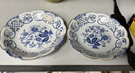 Pair of Antique Meissen Style Porcelain Blue Onion Bowls, 8"dia, Location Right Metal Shelves Pair of Antique Meissen Style Porcelain Blue Onion Bowls, 8"dia, Location Right Metal Shelves