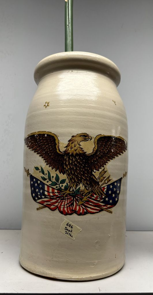 Large Stoneware Butter Churn, Eagle emblem, has rim chip, 18"h, Location Back Metal Shelves Large Stoneware Butter Churn, Eagle emblem, has rim chip, 18"h, Location Back Metal Shelves