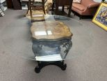 Modern Metal Pedestal Glass Top Breakfast Table, needs tightening, 30"h., 54"dia, Location Left Office 1 Modern Metal Pedestal Glass Top Breakfast Table, needs tightening, 30"h., 54"dia, Location Left Office 1