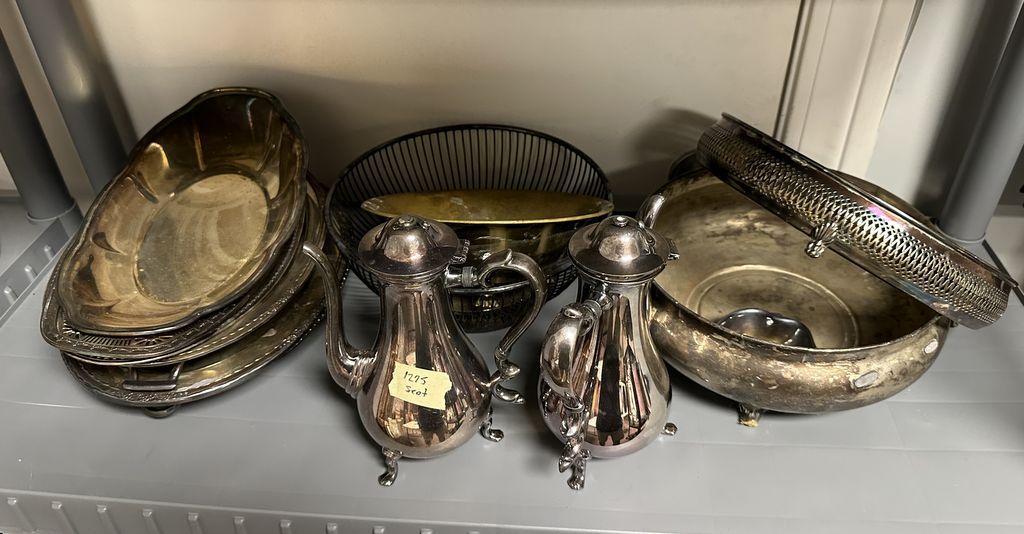 Group of Silver Plate Serving Pieces, Location Left Office 1 Group of Silver Plate Serving Pieces, Location Left Office 1