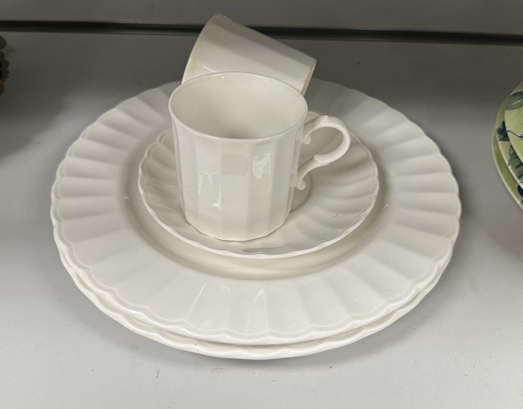 White Ironstone Plates and Cup, Location RIght Metal Shelves White Ironstone Plates and Cup, Location RIght Metal Shelves