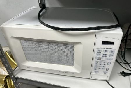 GE White Microwave, used, Location Right Metal Shelves GE White Microwave, used, Location Right Metal Shelves