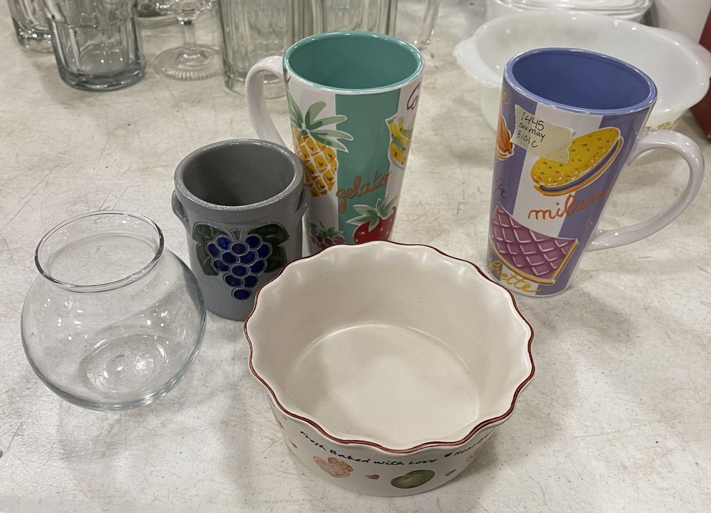 Ceramic and Glass Pieces Two Mugs, Bowl, Glass Vase, and Cup with Gapes Right Metal Shelves Ceramic and Glass Pieces Two Mugs, Bowl, Glass Vase, and Cup with Gapes Right Metal Shelves