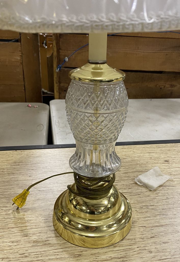 Glass and Brass Candle Stick Lamp, Location Back Metal Shelves Glass and Brass Candle Stick Lamp, Location Back Metal Shelves