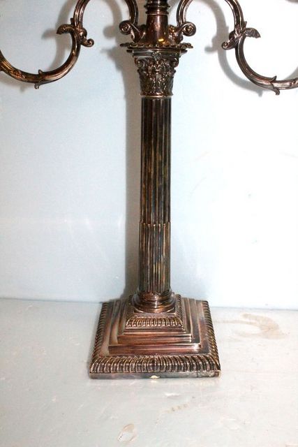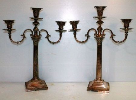 Pair of English Sheffield (Mappin Brothers) candlesticks with Corinthian columns, three arms; 13 1/2" w., 18 1/2" h. Pair of English Sheffield (Mappin Brothers) candlesticks with Corinthian columns, three arms; 13 1/2" w., 18 1/2" h.