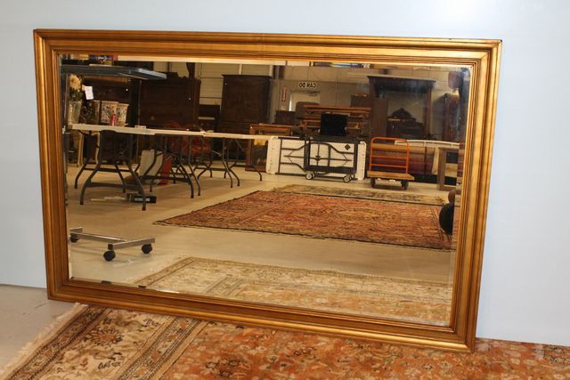 Large contemporary, beveled glass, gold frame mirror; 66" w., 43" h. Large contemporary, beveled glass, gold frame mirror; 66" w., 43" h.