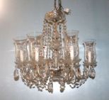 Six arm crystal chandelier with swags and etched hurricane shades; 22" dia., 17" h. Six arm crystal chandelier with swags and etched hurricane shades; 22" dia., 17" h.
