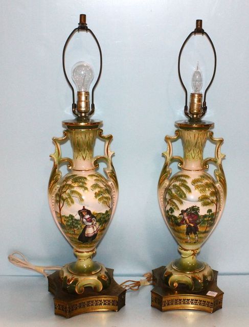 51 Pair of Handpainted Porcelain Urn Shape Lamps on Brass Base