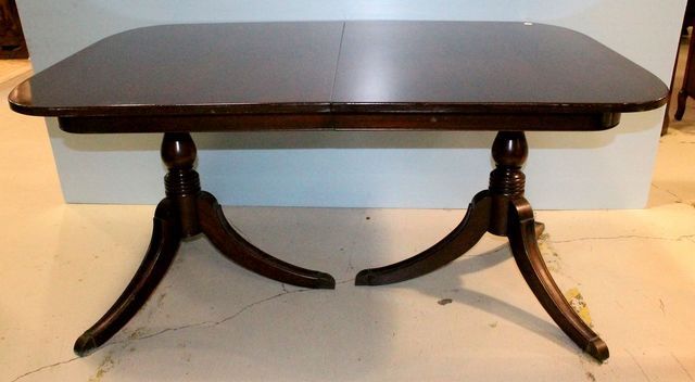Mahogany Duncan Phyfe style dining table, two pedestal, feet with brass caps, three leaves; 62" w., 42 1/2" d. 29" h. Mahogany Duncan Phyfe style dining table, two pedestal, feet with brass caps, three leaves; 62" w., 42 1/2" d. 29" h.