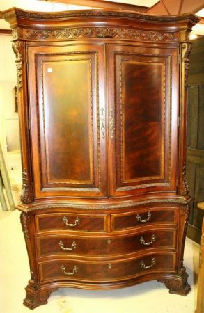 Heavily carved, four door entertainment center. Top section has two ornately carved doors; 54" w., 25" d., 84" h. Heavily carved, four door entertainment center. Top section has two ornately carved doors; 54" w., 25" d., 84" h.