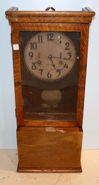 Antique oak international time clock, needs restoration; 15 1/2" w., 9" d., 36" h. Antique oak international time clock, needs restoration; 15 1/2" w., 9" d., 36" h.