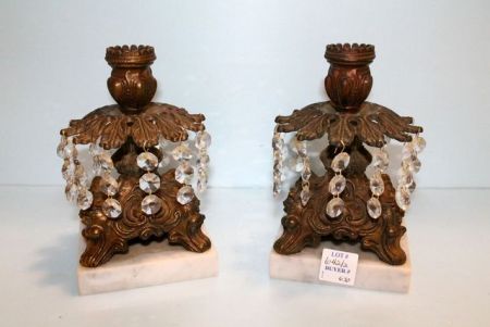 99 Pair of Brass Candlesticks With Prisms on Marble Base