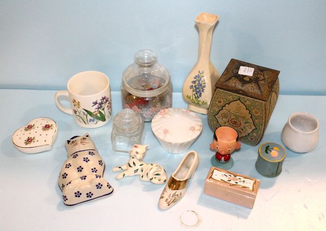 Including vases, mug, small boxes, 6" cat plaque Including vases, mug, small boxes, 6" cat plaque