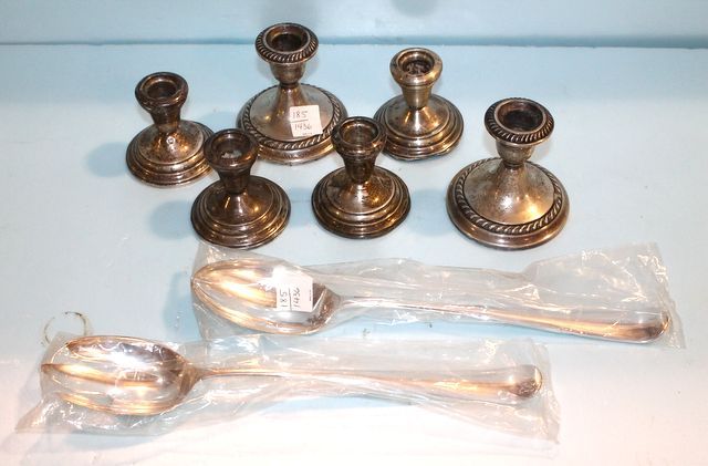 185 Three Pair Sterling Weighted Candlesticks (Some Damage), Silverplate Salad Set