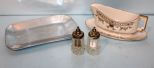 586 Salt/Pepper, Porcelain Gravy & Pewter Tray
