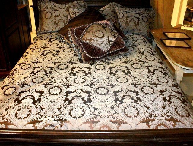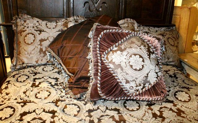 Queen size bedspread and five pillows from the Isabella Collection. Beautiful satin damask, velvet/ satin pillows with fancy fringe Queen size bedspread and five pillows from the Isabella Collection. Beautiful satin damask, velvet/ satin pillows with fancy fringe