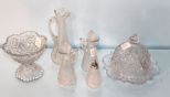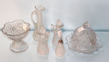 619 Press Glass Covered Butter Dish, Compote, Vinegar Jars, Shakers & Cruet
