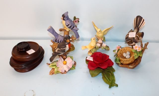620 Group of Four Porcelain Figurine Birds, Porcelain Rose & Stands